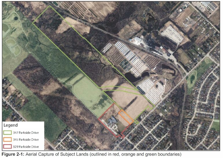 The owners of the property, 2441066 Ontario Inc., have been seeking to have approximately 6.2 hectares of the property fronting onto Parkside Drive added to Hamilton’s urban boundary. The lands are presently within the Greenbelt, on the border with the urban boundary.